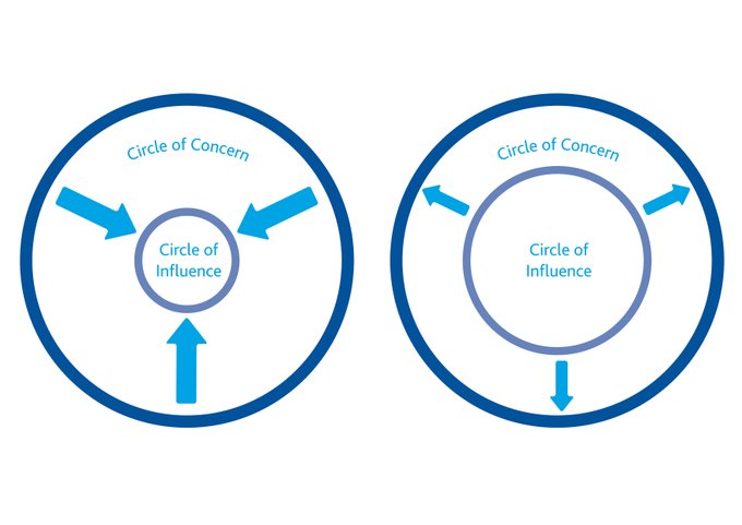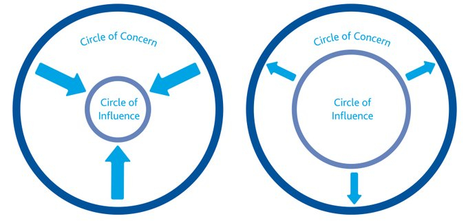 Covey suggests that we first note all our concerns (illustrated by the big circle), then pick out the things we can influence (the smaller circle in the middle)